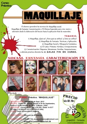 El alumno aprenderá las técnicas de: Maquillaje social, Maquillaje de Fantasía, Caracterización y FX Efectos Especiales para cine, teatro y televisión desde la elaboración del boceto hasta la aplicación final de materiales.